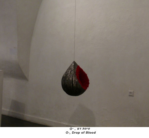 The drop, hanging from the ceiling, consists of two parts made of very different materials: fabric and iron. The combination of these materials creates a body that intrigues the eye and the touch as well. The outside is a hollow iron body of cold and hard material, and the inside is a soft and warm red fabric coating. The artist has great interest in creating interesting textures with the aim to stimulate the eye - the seeing as well as the hand – the touch.